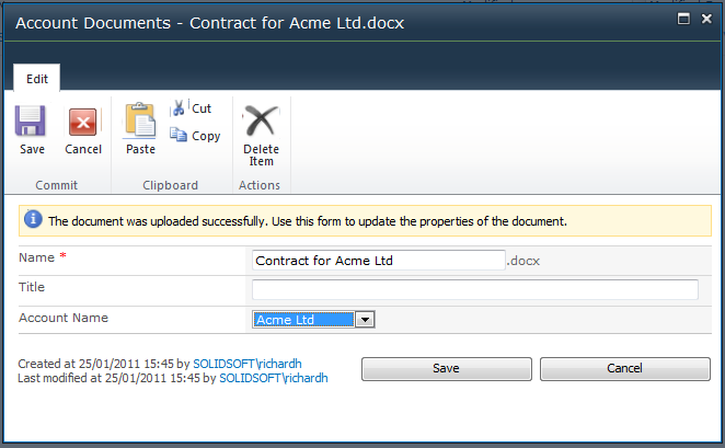 As you can from the above screenshot the add document dialog is really no different to the dialog that would be presented when using the choice column type. However, when the document has been uploaded and you view the document library you can see there is one major difference the Acme Ltd value in the account column is a hyperlink. If I click on this hyperlink a dialog window will appear which will show me the additional metadata which is stored against this entry.