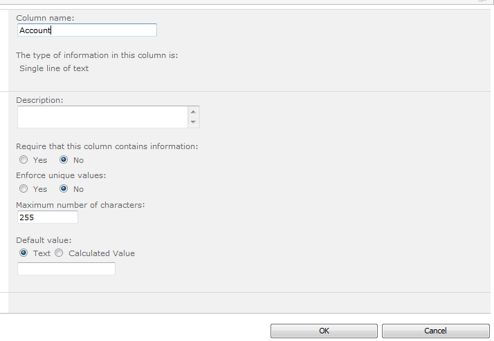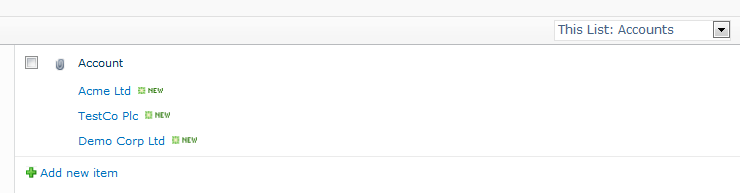 When SharePoint 2010 creates a new list it will helpfully add some columns by default (Title, Created By etc.) now I could use the existing column headers, but to make it easier and more logical for me I am going to change the name of the default column from Title to Account.