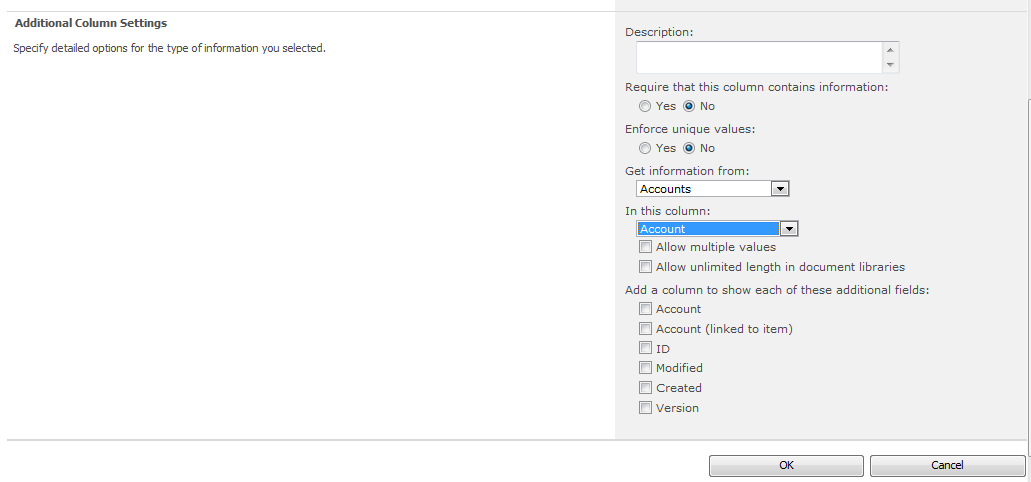 As you can see from the above screenshot when you select the Lookup column type, SharePoint will present you with a drop down which lists all of the possible sources of data for this column. I am going to select the list that I created earlier in the Get information from drop down and then the Account column in the In this column drop down.