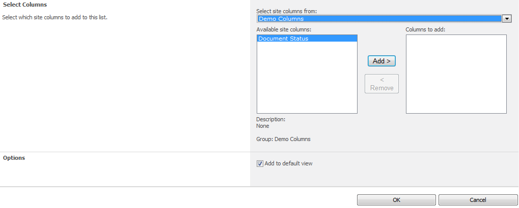 In this group I can see all the custom columns that I have created and added to this group. I can then select the column that I want to add to my document library, click on “add” and then OK and it will have been added to the current document library.
