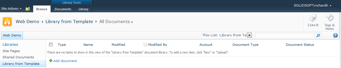 Note: Although the document library was created from a template, there is no difference between this and any other document library. It still retains all the default options and can be modified without impacting on the original or the template. The same is true of the document library the template was based upon.