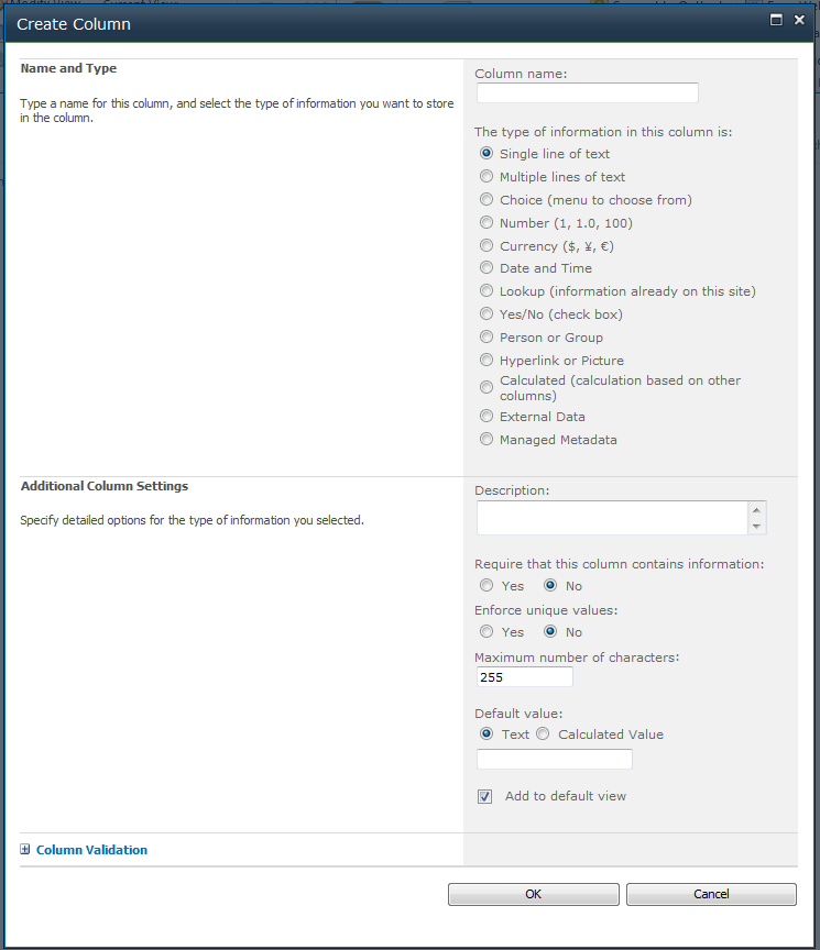 As you would expect there are a number of options which can be used when creating a new column, in this instance I will select the Single line of text option. I am going to create the column with the following information: