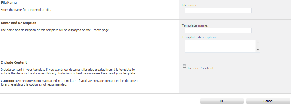 I need to give the template a file name and a template name, there is also an option to include the content, this can be useful if I have a requirement to re-use a set of default documents in a document library. However for this library I am going to use the following settings