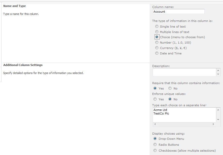 On the Change Column screen I am going to change the Name and type field to the Choice option. As soon as I select this option some additional fields have now been displayed. The new field I am interested in is the one labelled Type each choice on a separate line, in this box I am going to enter the two fictional client names I used earlier on (Acme Ltd and TestCo Plc) the other settings I will leave as the default values.