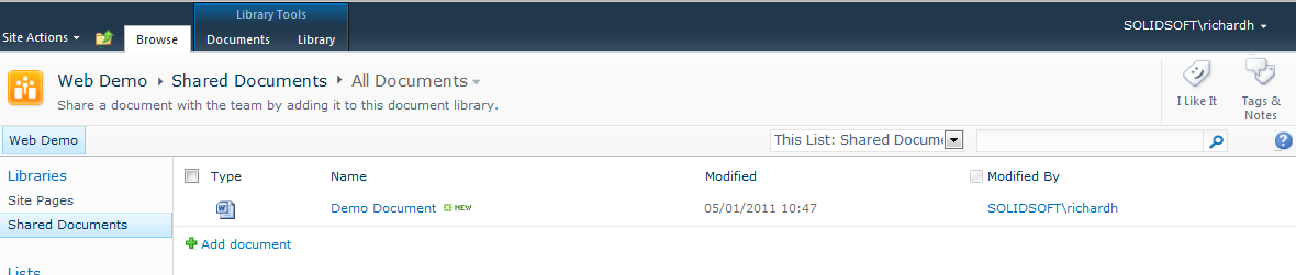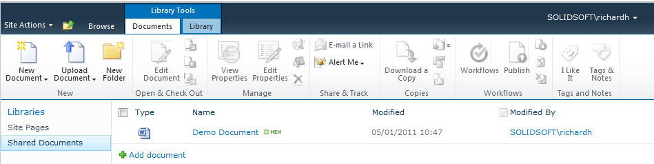 I am going to start by looking at a default\standard document library. When a new SharePoint site is created in you will most likely be provided with a default document library (usually named Shared Documents). Alternatively a new document library could be created (Site Actions –> New Document library).