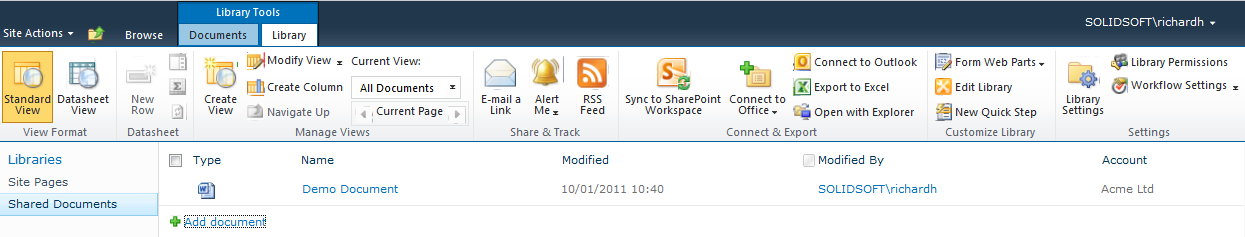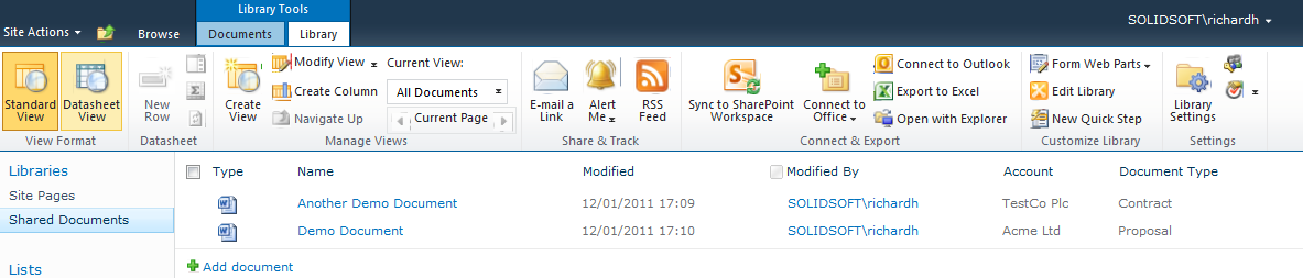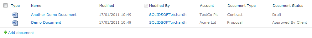 Now my document library allows me to add an account name (selected from a list) to a document and if I wanted to I can add more columns to this library, such as a document type column.