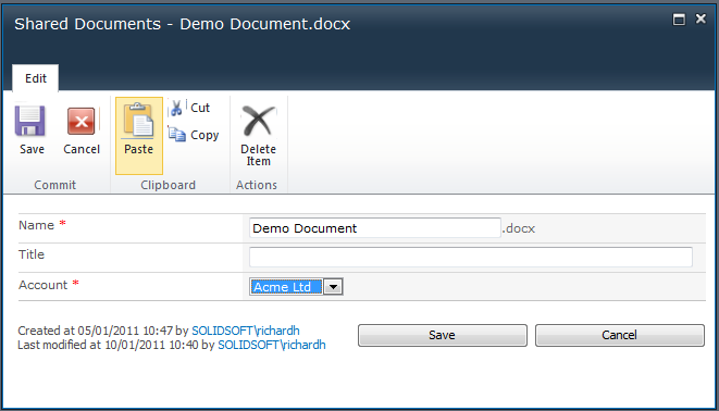 When I click on the OK button the changes will be made to the column. Now when I go to upload a document or edit a documents property you will notice that the account field has changed from a text field to a drop down menu. The same will be the case in the Document Information Panel within the Office suite.
