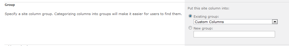 Now, when I select the create option to create a new document library, the New Site Column page should now appear, this screen is almost identical to the Create Column screen (see figure 1.9), apart from the Group section. This setting allows me to place my site column in an existing group or I can create my own group. Doing this makes it easier for me to find my custom column when I want to add it to a list or document library.