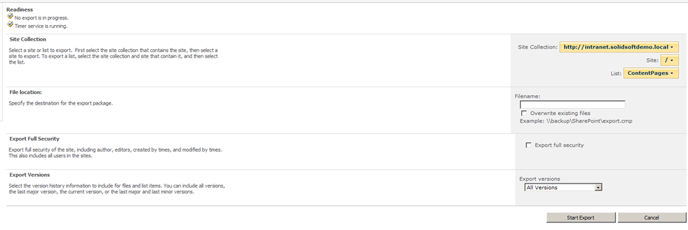 - On the Site or List Export page, select the appropriate web application, site collection and list that you want to export.
